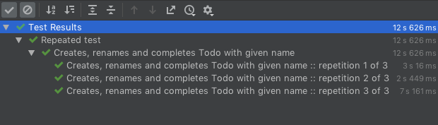 Powyższy scenariusz można bardzo łatwo wykonywać wielokrotnie, wystarczy dla każdego kolejnego wykonania zmienić nazwę zadania oraz w jakiś sposób zapisywać jego aktualny numer. W tym celu możemy użyć wbudowanego w JUnit 5 mechanizmu testów powtarzanych. Aby stworzyć taki test, wystarczy zamienić adnotację @Test na @RepeatedTest, podając przy tym liczbę powtórzeń jako jej atrybut value:
